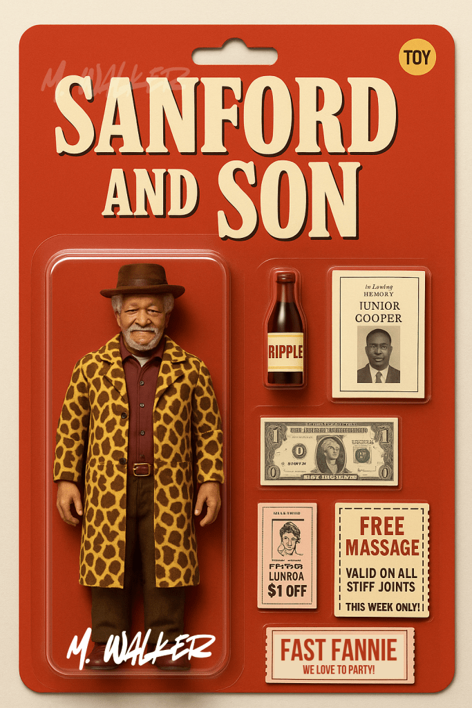 However, in a Sandford and Son fan group on Facebook that I’m a part of, a fellow member has been bombarding us with his rendition of Sanford and Son characters as action figures. In my humble opinion, they were either hit or miss, yet entertaining nonetheless.